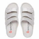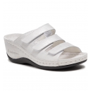 Klapki firmy Berkemann. Wykonane w całości z miękkiej skóry z perłowym połyskiem. Posiadają 3 paski zapinane na rzep (regulacja tęgości). Buty na lekkim koturnie 5cm.