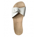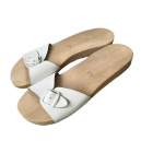 Klapki męskie na spodach drewnianych z profilem ortopedycznym, podeszwą przeciwpoślizgową i cholewką skórzaną.