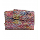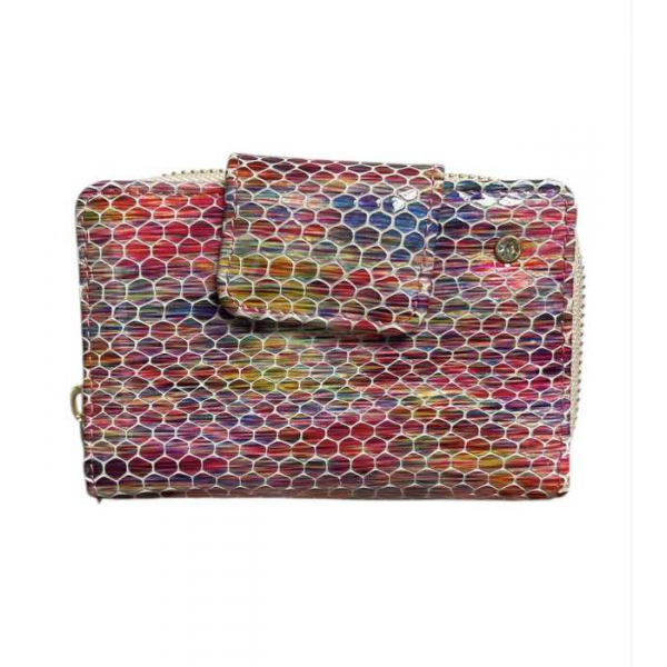 Skórzany portfel damski. Zapinany na zatrzask. Pojedyncza przegródka na banknoty i mniejsze na karty kredytowe. Osobna kieszonka na monety.
