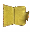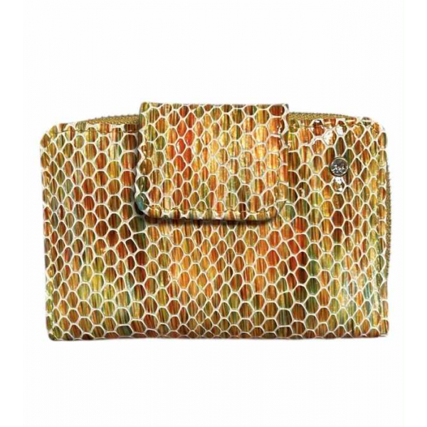 Skórzany portfel damski. Zapinany na zatrzask. Pojedyncza przegródka na banknoty i mniejsze na karty kredytowe. Osobna kieszonka na monety.