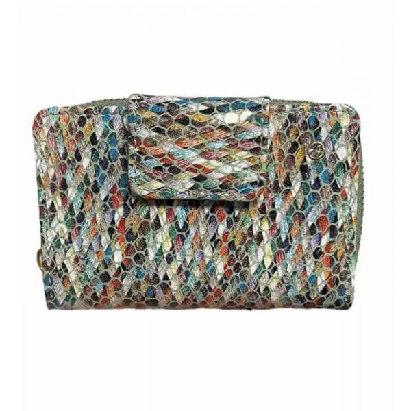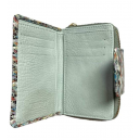 Skórzany portfel damski. Zapinany na zatrzask. Pojedyncza przegródka na banknoty i mniejsze na karty kredytowe. Osobna kieszonka na monety.