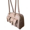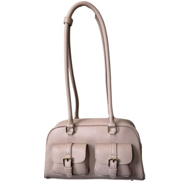 Mała torebka skórzana typu bagietka/kuferek. Jednokomorowa, zapinana na zamek. Z przodu posiada dwie małe kieszonki.