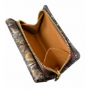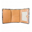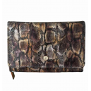 Skórzany portfel damski. Zapinany na zatrzask. Pojedyncza przegródka na banknoty i mniejsze na karty kredytowe. Osobna kieszonka na monety.